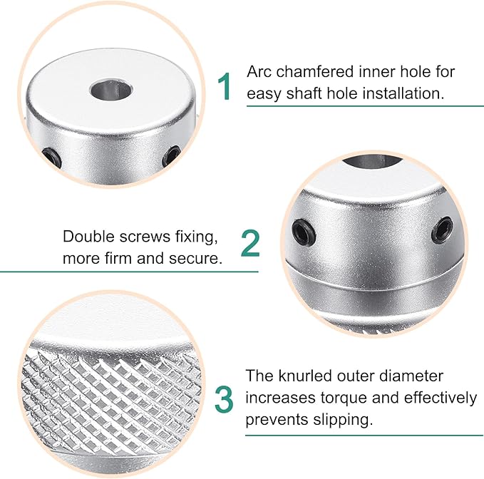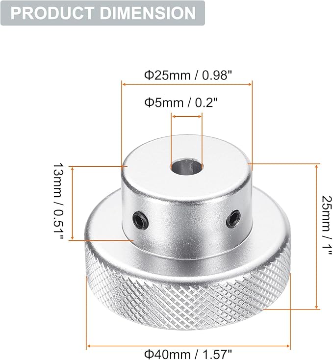 サイズ - 外径:40mm / 1.57"、ボア:5mm / 0.2"、高さ:25mm / 1"。軸を固定するための2本のネジが付属しており、より確実な固定を保証します。