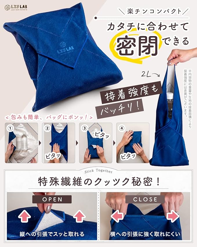 独自開発の接着強度が高い特殊な布素材を使用した お弁当 包み は機能性抜群!マジックテープやボタン式ではなく、生地のオモテ面とウラ面がどこでも自由に接着可能!(※ウラ面のアルミ蒸着部分は接着しません)。お弁当箱2段、ペットボトル、貴重品やタブレットまで、どんな形も楽ちん収納!風呂敷に包む感覚で自由自在!ピッタリ包み込み、バッグのなかもスッキリ最小コンパクト♪広げて ランチョンマット や ランチクロス としてもご活用頂けます!保冷バッグ としての機能性もピカイチ!お弁当や飲み物をピッタリ包み込み、空気の混入を抑えるので保冷保温効果も抜群!さらに最高水準の保冷保温性能を求め、機能性のより高いアルミ蒸着を選定しております!当商品は「一般財団法人カケンテストセンター」にて保冷保温性能試験を実施し、高い性能結果を得て商品化しております!是非一度、この新たな体験をお試しください。