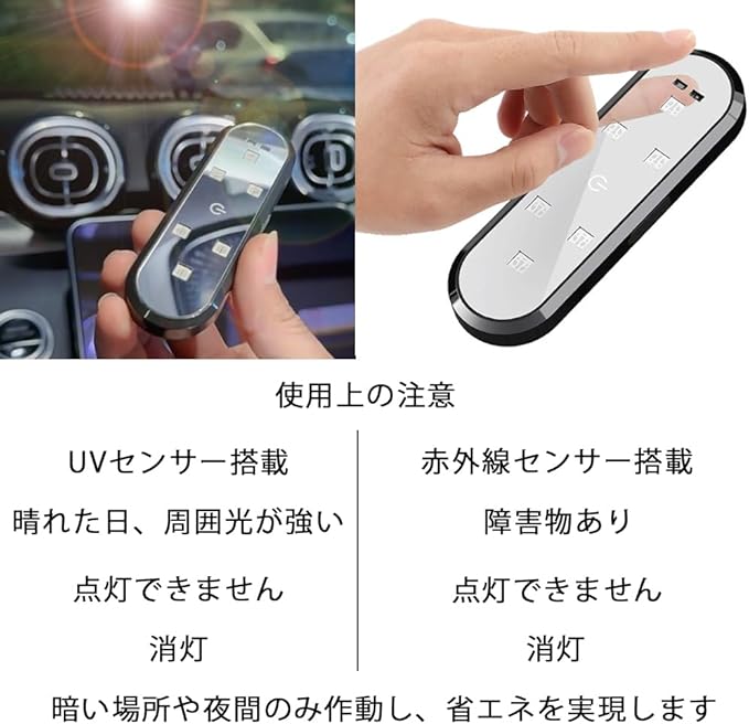 長時間作業:400mAh大容量バッテリー、充電時間は約2時間で、毎日の家庭用車での使用では約30日間動作可能です。注意事項: このランプには光センサーが付いています。周囲の光が明るいとライトが消え、点灯できない場合があります。暗い場所で使用してください。