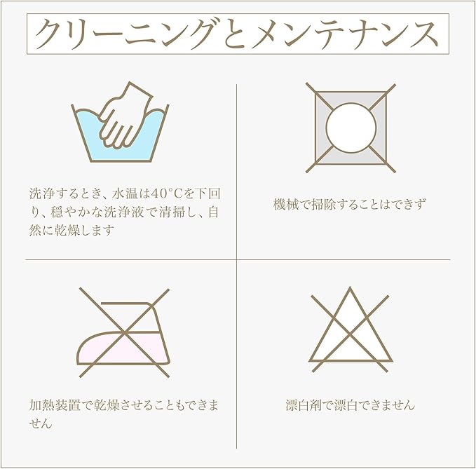 [ご注意ください] この製品は極端な温度には適していませんので、アイロンをかけないでください。手洗いをお勧めします。洗浄にはきれいな水または中性洗剤を使用してください。