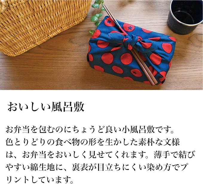 【おいしい風呂敷】お弁当を包むのにちょうど良い小風呂敷です。色とりどりの食べ物の形を生かした素朴な文様は、お弁当をおいしく見せてくれます。薄手で結びやすい綿生地に、裏表が目立ちにくい染め方でプリントしています。
