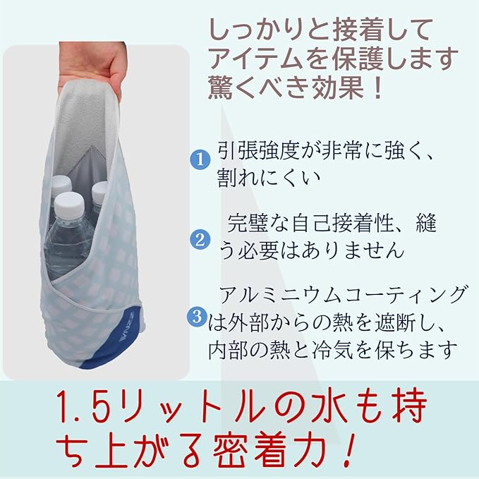 【想像以上の密着力―結ばなくてもズレずにしっかり固定】保冷ふろしきの表面は細かい繊維どうしが引っかかるように設計されていて、面ファスナーよりも簡単につけ外しできて、結ばなくてもズレにくく、食材の形に合わせて包むことができます。缶ビ一ル6本を包んで持ち上げても外れないほど、接着力と耐久性があります。