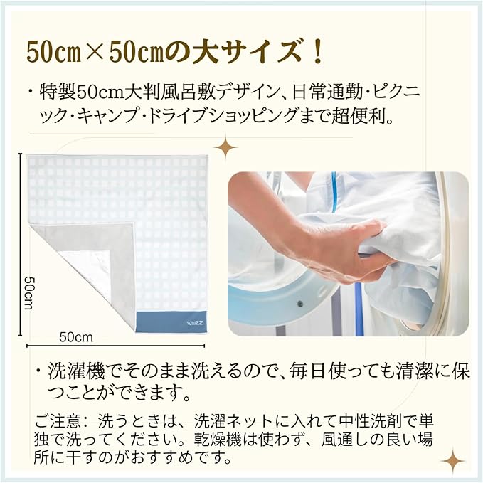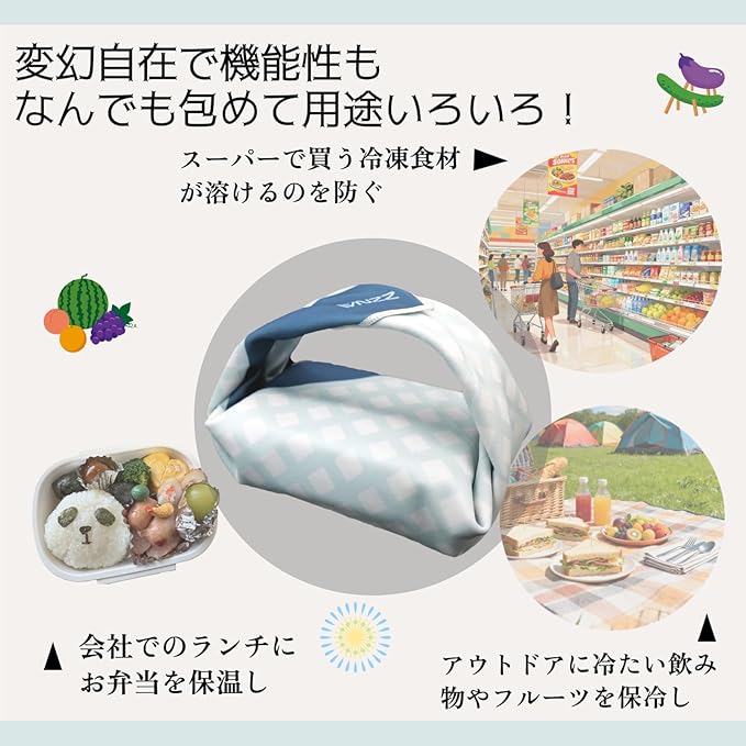 【肉や魚の大パック対応―まとめ買い派も満足の50X50サイズ】まとめ買いの日も、お肉をたくさん買った日も大丈夫。これ1枚で最大4パックまとめて包めます。エコバックにプラスしてとても便利です。冷蔵商品やアイスクリームなどの保冷用途はもちろん、お弁当や温かい唐揚げやコロッケなどの保温にもお使いいただけます。使わないときはハンカチのように畳んでコンパクトに持ち歩けるのも魅力の1つです。