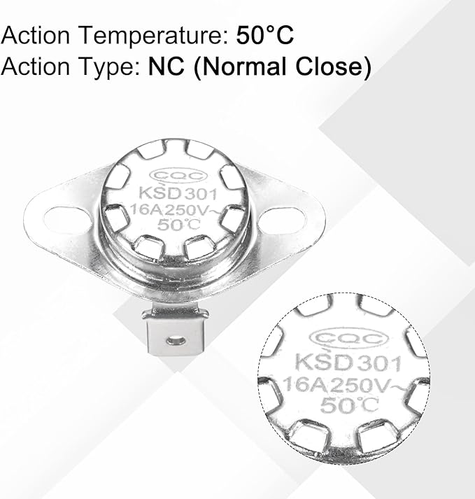 通常閉じ: 温度制御スイッチの接点の元の状態は閉じており、温度センシングが定格温度50度セルシウス度を超えると開く