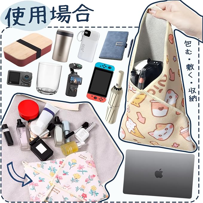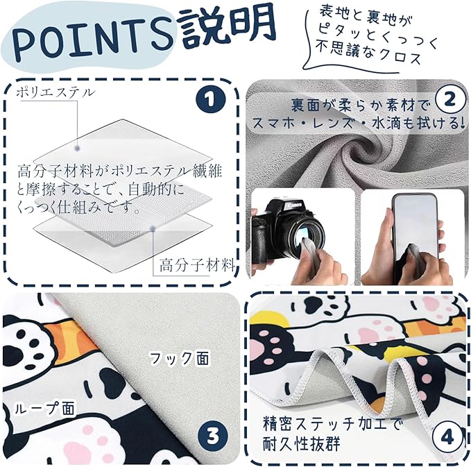 【ぺたぺた魔法クロス】ペタッと貼るだけでお弁当箱やペットボトル、小物をすっきり包める便利なランチクロス!そのままカバンに入れても剥がれないから、収納がとっても楽ちん。吸水性があるので濡れた物も安心。裏側のやさしい毛生地でホコリや汚れを拭き取ります。 繊細な画面やレンズも傷まない。貼って剥がさずにそのまま持ち運べるから、毎日の収納ストレスを解消します.