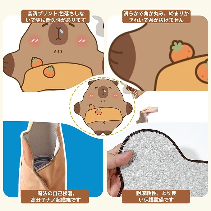 【サイズと素材|頑丈で洗濯可能な特殊くっつく生地】40 42cm のサイズで、可愛らしいカピバラ模様のマルチクロス。ポリエステル系マイクロファイバー素材を使用し、軽量で耐久性に優れ、繰り返し洗濯も可能。特殊なくっつき仕様の生地により、布同士が簡単に貼り合わせられ、お弁当包みやくっつくタオルのように、中身のサイズや形状に関係なくピタッとフィットします。カピバラの柔らかいイメージに合わせた仕上がりで、自宅や外出先で長期的にご活用いただけます。