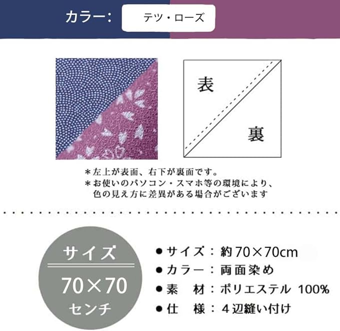 ふろしき 風呂敷 リバーシブル 鮫小紋 桜 ちりめん 両面染め 四面縫製 70cm 二巾 お弁当包み ラッピング ギフト包み 瓶包み 着物お稽古バッグ クロス エコバッグ おしゃれ (テツ/ローズ) | KAZESHOP