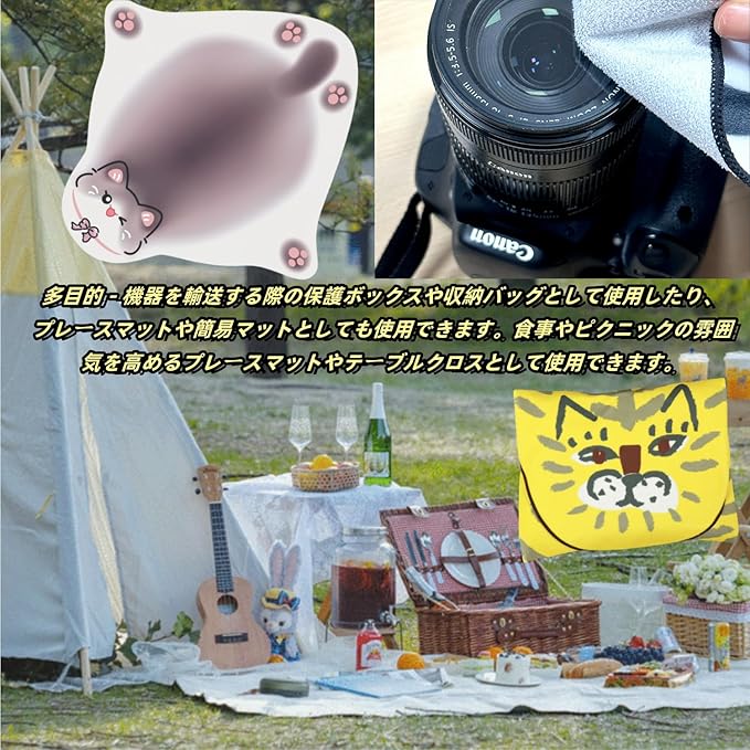 【幅広い用途】粘着タオルは、一眼レフカメラやレンズ、タブレット、ノートパソコンなど、さまざまな電子機器に適しています。どのような形にも巻き付けやすいので、機材運搬時の保護箱や収納バッグとして、またランチョンマットや簡易マットとしても使える万能アイテムです。ランチョンマット、テーブルクロスとして使え、食事やピクニックの雰囲気アップ。贈り物包装にも適し、かわいい外観で気持ちを伝える。調理中の汚れ拭き取りも可能で、多用途の便利アイテム。