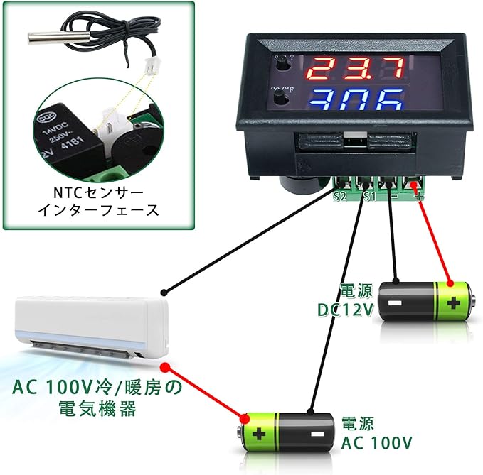 【動作パラメータ】:温度測定範囲:-50℃〜110℃。精度:0.1 C。リフレッシュレート:0.5S。電源を接続してコントローラーに電力を供給し、測定温度を表示します。入力電圧:DC12V。出力:20Aリレー(1つの出力)。