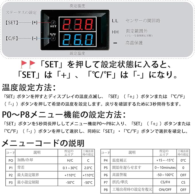 【設定方法】:「SET」ボタンを押すとディスプレイの温度が点滅し、「SET」(「+」)ボタンまたは「℃/℉」(「-」)ボタンを押して希望の温度を設定します。戻りを確認するために3秒間待ちます。 「SET」ボタンを5秒間長押ししてメニュー機能P0〜P8に入り、「SET」(「+」)ボタンまたは「℃/℉」(「-」)ボタンを押して選択し、同時に「SET」・「℃/℉」ボタンで選択を確定します。