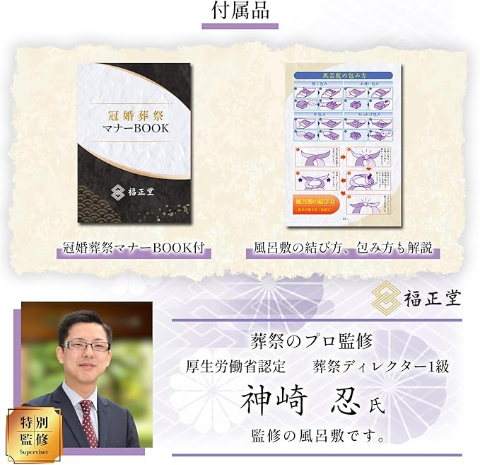 ✅【風呂敷の包み方、結び方を解説】冠婚葬祭マナーBOOK付 風呂敷の結び方、包み方も確認できます。葬祭のプロ監修 厚生労働省認定 葬祭ディレクター1級 神崎 忍氏 監修の風呂敷です。