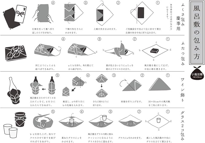 ランチボックスや小物、お使い物などを包んだり、海外へのお土産や、お祝いなどのギフトにもおすすめ