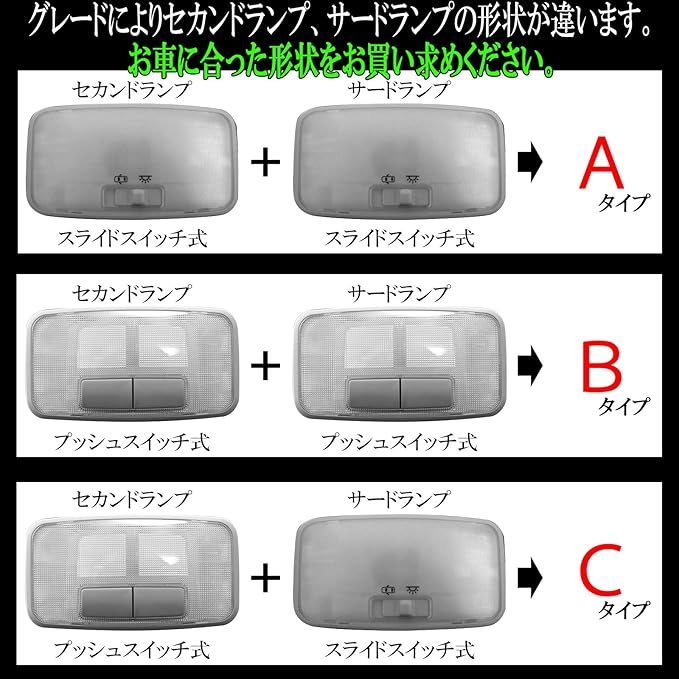 グレードや乗車定員により2列目、3列目ランプ形状が異なります。お車に合ったタイプをお買い求め下さい。