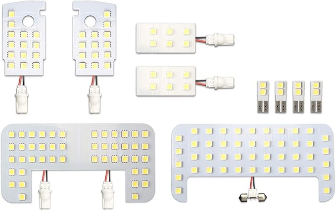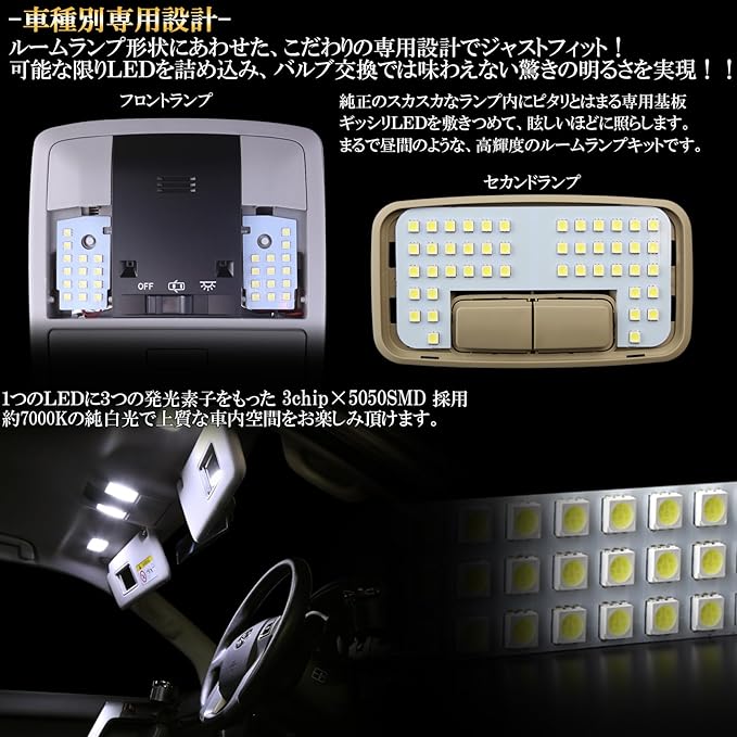 ルームランプユニットにピタリとはまる車種別専用設計基板。可能な限りLEDを詰め込みバルブ交換では実現できない驚きの明るさ。マップランプ、ドームランプ、バニティランプ、カーテシランプのフルセットです。