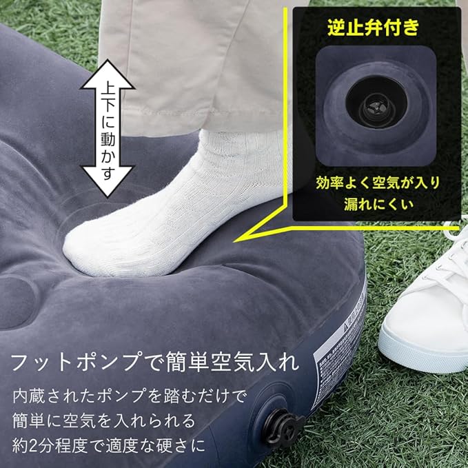 ポンプ不要で、マットに内蔵されたポンプを足踏みするだけで簡単に空気が送れます。
