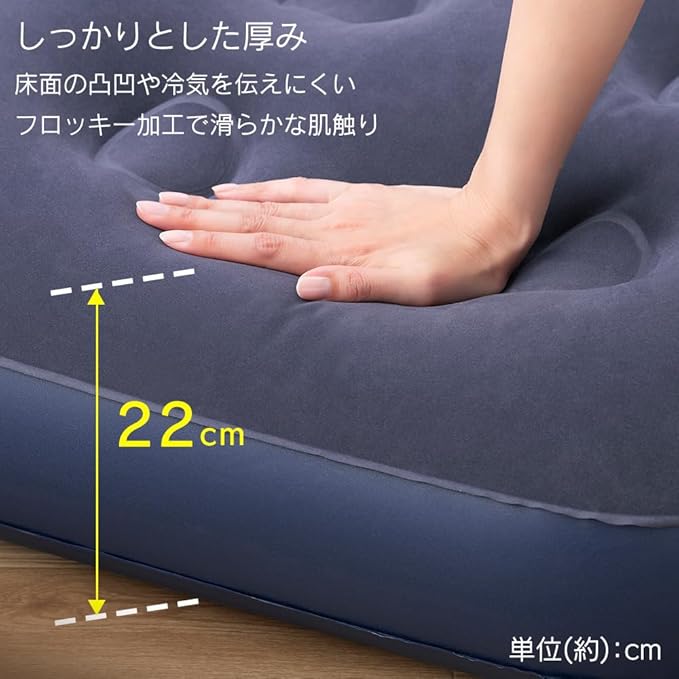 しっかり膨らませたときの厚みは「約22cm」となり、なめらかで肌触りがよい表面加工です。