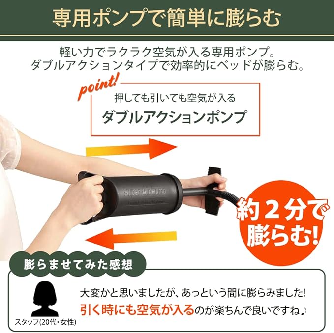 ダブルアクションタイプで効率的にベッドが膨らむ。