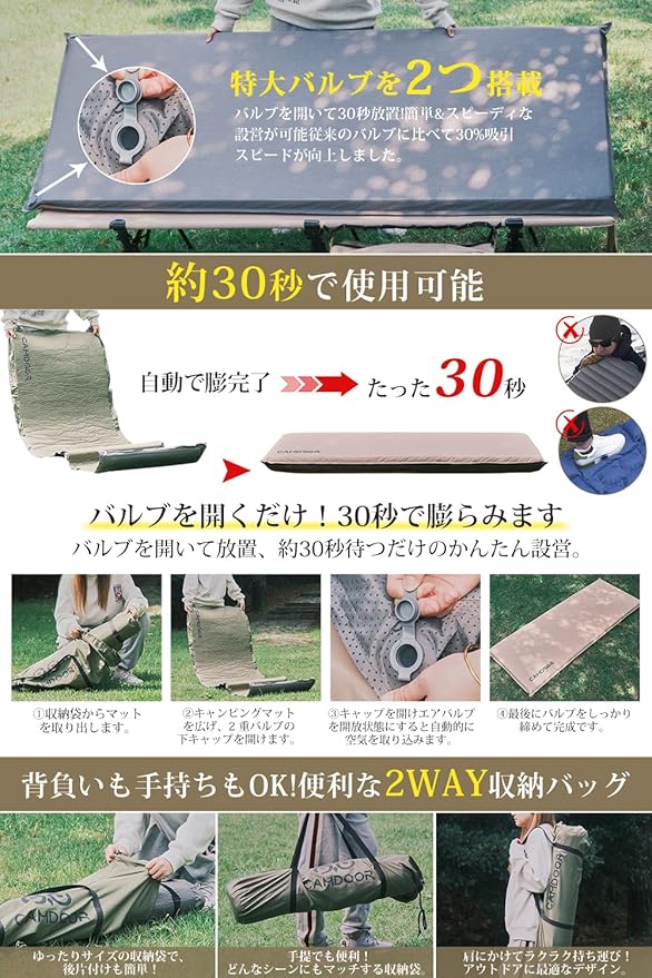 ✅ 【自動拡張! 特大バルブ2個搭載】当社のキャンプマットには、2024年にアップグレードされた最新の2-in-1バルブが装備されています。 漏れはありません! バルブには 2 つのモードがあります。 膨張モードにすると、空気が自動的に素早く入ります。 排気モードでは、空気は排出されるだけで、吸入されません。 そのため、キャンプマットを折りたたんだときに再び空気が入る心配はありません。 さらにオーバーサイズバルブを2個搭載することで膨張と排気スピードがアップ! 簡単かつ迅速に使い切って保管できます。 約30秒空気を入れて使用します。 女性でも簡単に使えます。