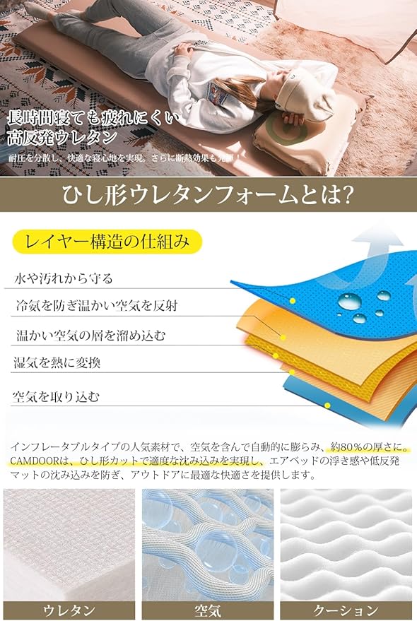 ✅ 【市場とは異なる堅牢な素材】令和6年最新進化版です!エアマットレスの正面は210T複合PVC+高反発スポンジ素材。高い強度の防水性を持って、汚れてもタオルで拭き取れば大丈夫です。人間工学に基づいてデザインされたキャンプマットは深い睡眠を促進し、体の自然な形状を維持し、ソフトな手触り、高反発。 地面との接触はありません!ぐっすりと眠ることができます。自動膨張式スリーピングパッドの裏面は滑り止めです。 どんなシーンでもしっかり使えます。 エアマットの裏側はポリエステルで、太い枝を使って強く切っても破れにくい素材です。