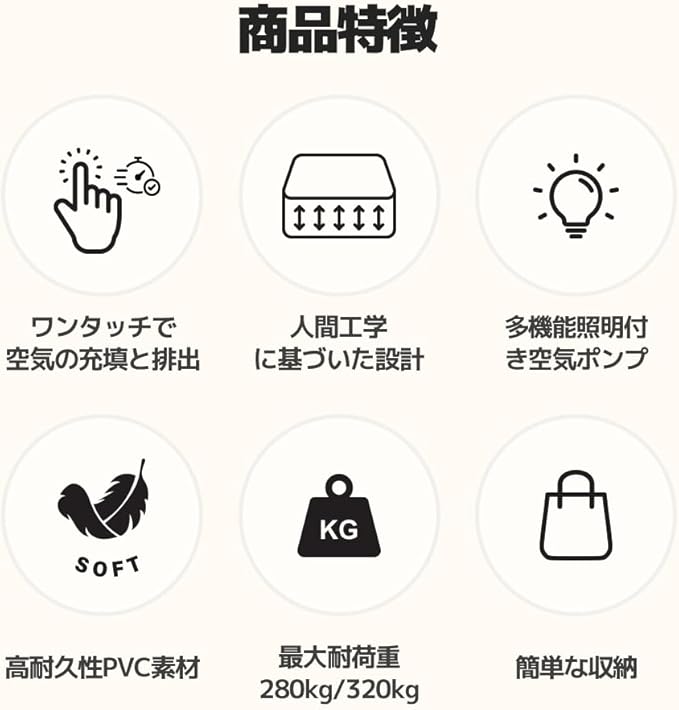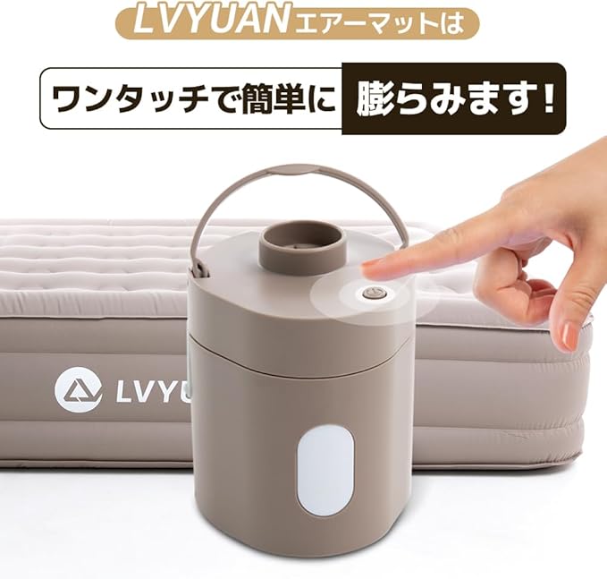 ☀ 主な特徴: 高耐久性・高サポート力・軽量化 従来品より200%の耐久性、135%のサポート力、15%の軽量化を実現しました。 多機能電動ポンプ付き 充電、LEDライト照明、モバイルバッテリー機能を備えています。充電ケーブルは50cmから120cmに延長され、アウトドアでの使用がさらに便利になりました。 修理シール付属 万が一エアーベッドが破損した場合でも迅速に修理が可能です。 最新のエアーベッドで、快適なアウトドア体験をお楽しみください。
