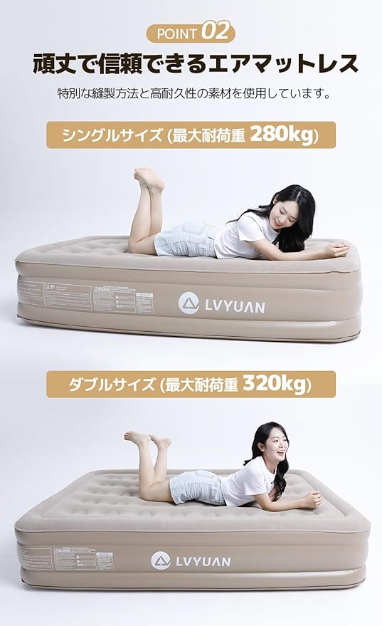 ☀ダブルサイズ(Queen)空気注入式 エアーベッド製品サイズ(約) 202*152*40cm 重さ:7.4KG 耐荷重(約)300kg 素材 :ポリ塩化ビニル(PVC) 室内でもアウトドアでもマルチに使えます。【120秒で設置・撤収】 :LVYUAN(リョクエン)エアーベッドには、ダイヤルを回すだけで120秒で設置・撤収が可能な内蔵式電動ポンプが装備されています。外部電源要らない、本格的なアウトドアエアーマットです!