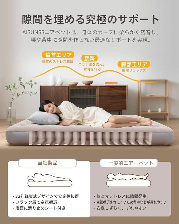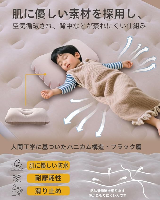 【究極の耐久性と快適性 ‐ 32孔蜂巢式デザイン】このエアベットは32孔蜂巢式デザインを採用し、複数のポイントでサポートを提供し、体圧を効果的に分散させ、構造の安定性を保っています。人間工学に基づいたデザインで、どんな姿勢で寝ても、ハニカム構造の表面ごとに体を支え、ベットを体に密着させ、快適な睡眠を楽しむことができます。底面には強靭なPVC素材を使用し、穿孔や変形を防ぎ、長時間使用しても耐久性を保つことが可能。また底辺と側面には、防水機能を備えており、汚れも簡単に拭き取れ、手入れが非常に簡単です。表面は柔らかいベロア素材を使用しており、優れた防水性と通気性だけでなく、快適さと実用性を兼ね備えています。