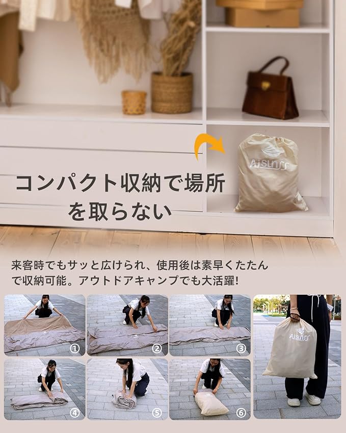 【多機能で便利なベット・様々なシーンに適用】キャンプやアウトドア活動だけでなく、日常的に家庭で使用しているベッドとしても利用できます。急な来客時には、簡単に臨時のベッドとして提供することが可能です。防災用品としてもおすすめで、地震や災害時に非常に役立ちます。また、車中泊や引越し時の簡易ベッドとしても便利です。家庭用として日常的に使えるだけでなく、スポーツ大会や花見などのイベント、さらに家族で中庭でのバーベキューや遊びにも最適です★快適な睡眠体験を提供し、使用しないときは空気マットを簡単に保存できます。