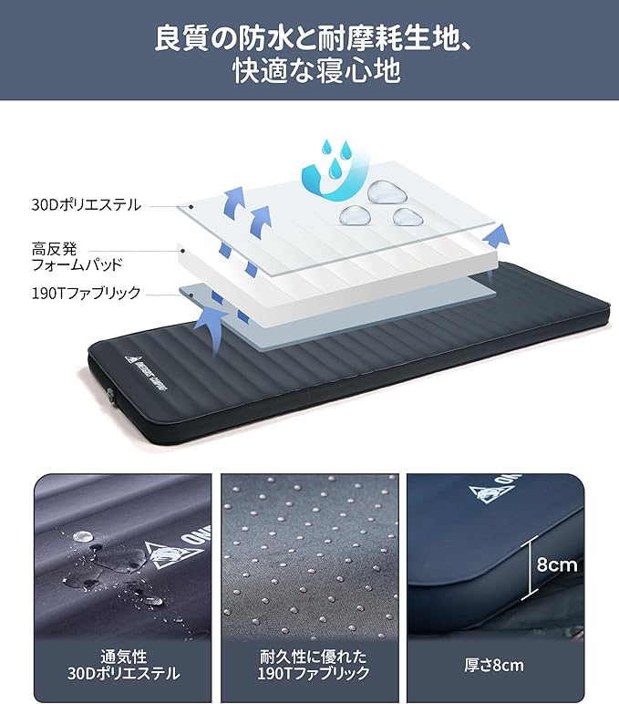 【快適な耐磨耗素材】エアーマットレスのカバー生地と側壁は、最新の30D伸縮性ファブリック生地にTPUコーティングを施し、ソフトで音が小さい、防水、耐磨耗、耐引裂性、耐久性に優れています。 裏生地は高温耐摩耗性、軽量190Tポンジ生地を使用し、裏生地に滑り止め粒子を加え、滑り止め性を向上させています