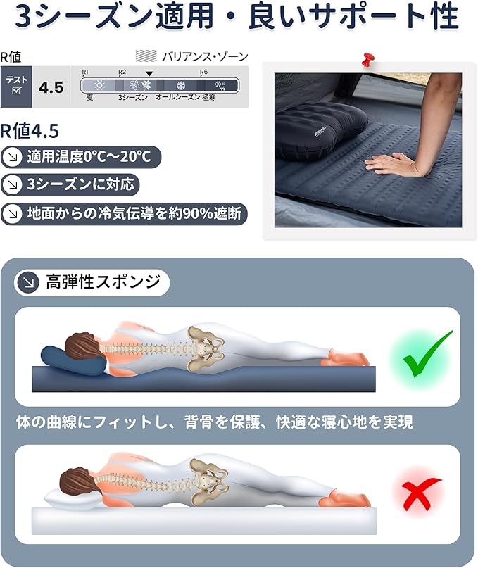 【コンパクトさ大幅に向上】OneTigris LIGHTDREAM インフレータブルマットはユニークなスポンジ構造で、もっと小さくコンパクトに折りたたむことができ、収納サイズはただ31 17 17cm、従来の3Dシングルマットと比べて、収納容積を2分の1に減らします。また、重量も30%削減され、寝心地は低下せず、より軽く、より持ち運びやすい。R値は4.5で、4シーズンに対応でき、冬キャンプは寝袋や毛布と併用するとより暖かくなります