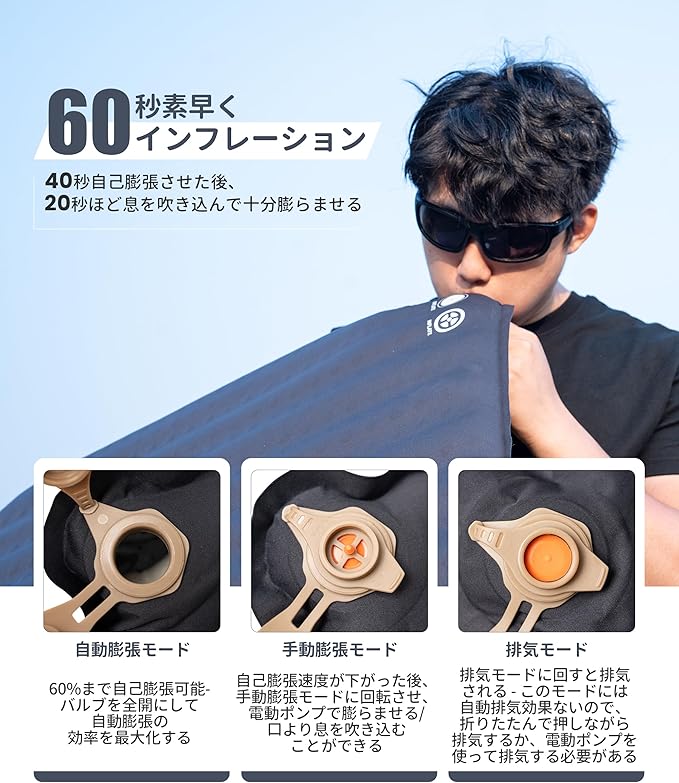 【自己膨張式・使いやすい】バルブを全開して、60秒以内に60%まで自己膨張することができます。その後、数回息を吹き込むことで100%まで膨らませます。空気ポンプがなくてもすぐに使えます。空気入れポンプを使えば、より素早く空気を入れることもできます。ノズルサイズ(内径20mm)は、市販されているほとんどの電動ポンプに対応、使いやすくなります