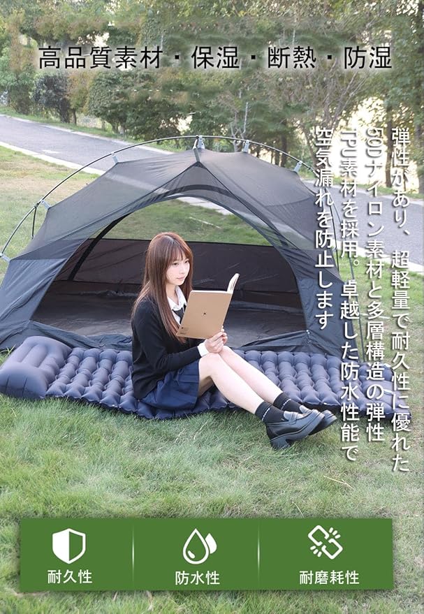 【高耐久50Dナイロン素材】キャンプ用マットはアウトドアグレードの50Dナイロン素材と多層防水耐久性TPU素材を採用し、高強度・柔軟・無音・防水の特長を備えています。人間工学に基づいた設計で、過酷なアウトドア環境でも安眠可能。厳しい品質検査を通過した充気式キャンプマットをどうぞご安心してお使いください。アウトドアマット、キャンプマット、テントマットなど多用途にご利用いただけます。