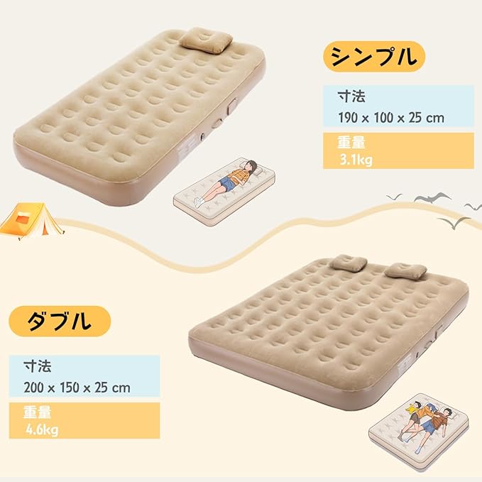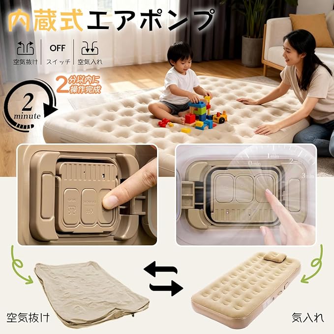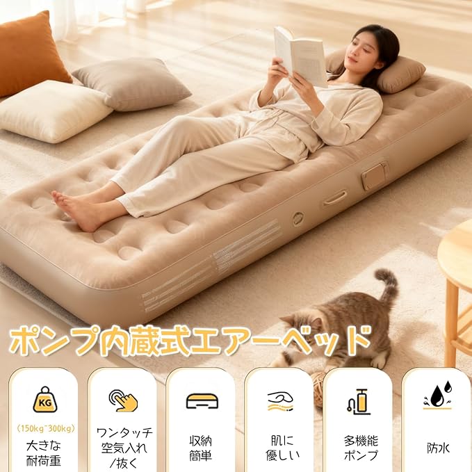 快適な睡眠のための革新的なエアーベッド。厚さ40cmの贅沢な寝心地で、シングルサイズ(188x102x25cm)のマットレスは内蔵式電動エアーポンプを搭載。わずか2分で簡単に膨張・収縮が可能で、ワンタッチ操作で誰でも扱いやすい設計です。耐荷重150kgで、防水性と通気性を兼ね備えた素材を使用。アウトドアや花見、室内での仮設ベッドとして多目的に活躍します。家庭での来客用や防災用としても最適です。快適な睡眠環境を提供する高品質なエアーマットレスで、日常生活からアウトドアまで幅広いシーンでご利用いただけます。なお、車中泊での使用には適していませんのでご注意ください。