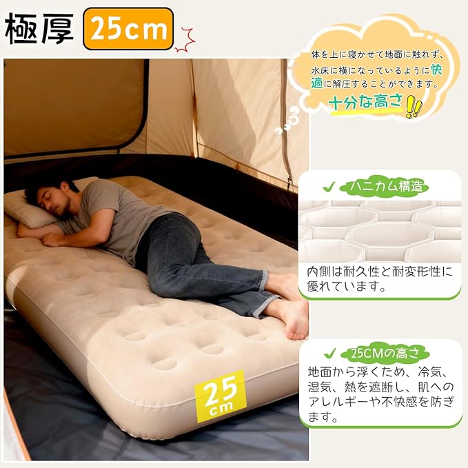 エアーベッド 厚25cm 電動エアーマット シングル188x102x25CM ワンタッチ操作 自動膨張・収縮 花見 アウトドア キャンプ用 エアーマットレス 内蔵式電動エアーポンプ 防水/通気性/快適 仮設ベッド 家庭用 防災非常用 車中泊不可 耐荷重150kg | KAZESHOP