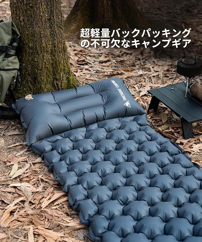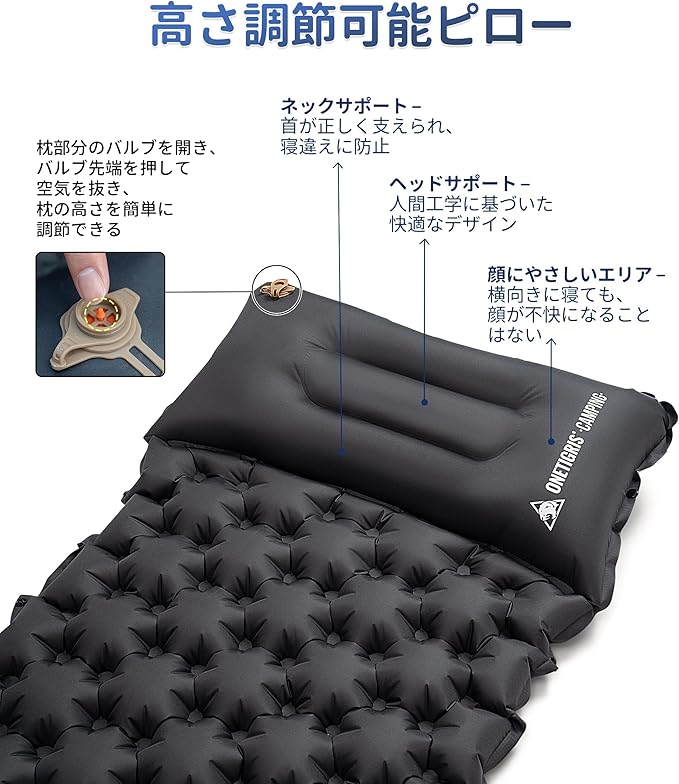 【バランスなサポート・クッション性よい】OneTigris BLACKCRYSTAL エアーマットは卵型気室構造、ハニカム空気室は体圧分散でき、仰向けでも横向きでも、良いサポートを確保。卵型の構造は、追加の保護層を必要とせずに直接衝撃を吸収し、クッション性もよい。 枕と一体化したデザイン、調節可能なエアバッグ枕(枕のバルブで微小空気調節)、首椎の曲線にフィット、従来のエアー枕の首吊りなどの問題を避ける