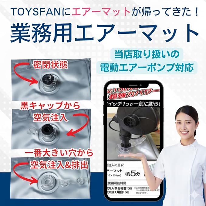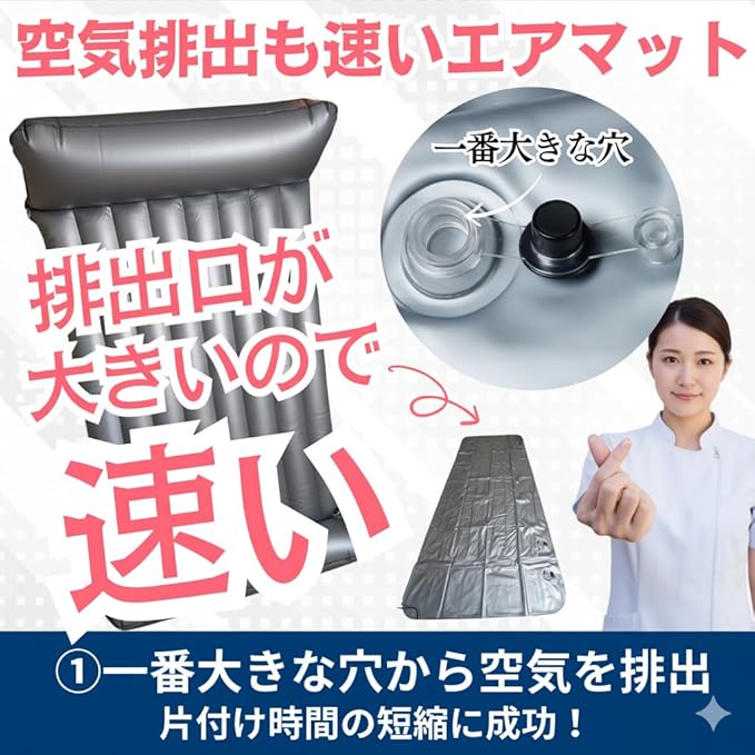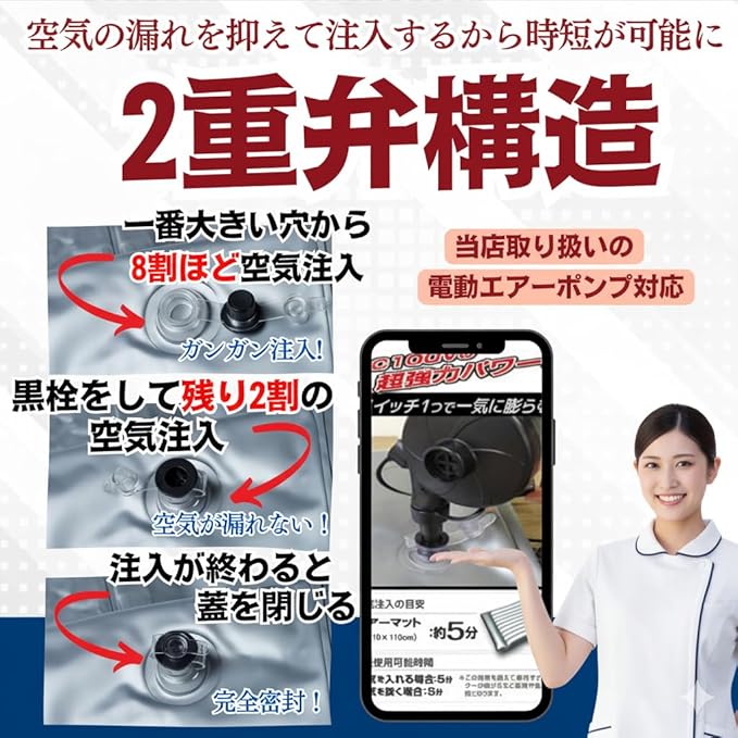 【商品スペック】 タイプ:9山両枕 サイズ:長さ約210cm 幅約115cm 高さ約16cm 空気注入口:約18mm カラー:シルバー 耐熱温度:80℃ エアーマットに熱水を使用しないでください。破損、変形、劣化の原因となります。 夏場などの高温となる屋外での使用は非推奨となります。 エアーマットを洗浄する際は、ぬるま湯か水を使用してください。 製造国:中国製 付属品:補修シート