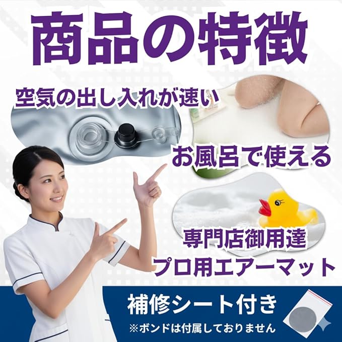 【商品スペック】 タイプ:8山片枕 サイズ:長さ約190cm 幅約97cm 高さ約16cm 空気注入口:約18mm カラー:シルバー 素材:PVC 耐熱温度:80℃ エアーマットに熱水を使用しないでください。破損、変形、劣化の原因となります。 夏場などの高温となる屋外での使用は非推奨となります。 エアーマットを洗浄する際は、ぬるま湯か水を使用してください。 製造国:中国製 付属品:補修シート