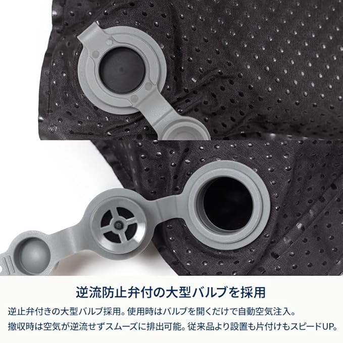 ✅【逆流防止弁付の大型バルブ】逆止弁付きの大型バルブを採用。使用時はバルブを開くだけで自動で空気が注入され、撤収時には空気が逆流することなくスムーズに排出することができます。従来品より、膨張スピードも片付けのしやすさも向上しました。