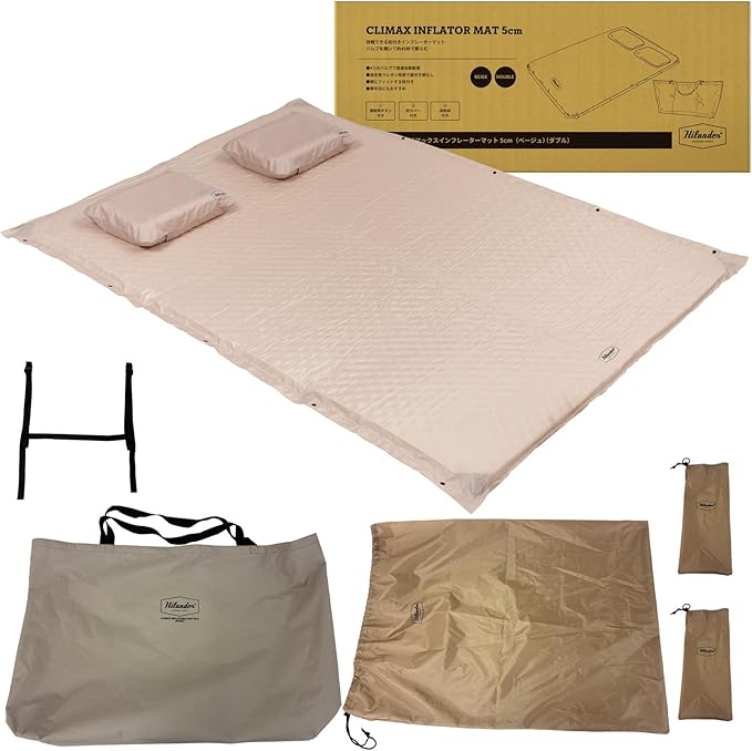 Hilander(ハイランダー) クライマックスインフレーターマット ダブル 8cm/5cm インフレータブル 車中泊 5cm ダブル ベージュ 枕付き ウレタン コンパクト 快適 快眠 爆睡 エアマット 自動膨張 逆流防止弁 腰痛 2人用 連結可能 | KAZESHOP