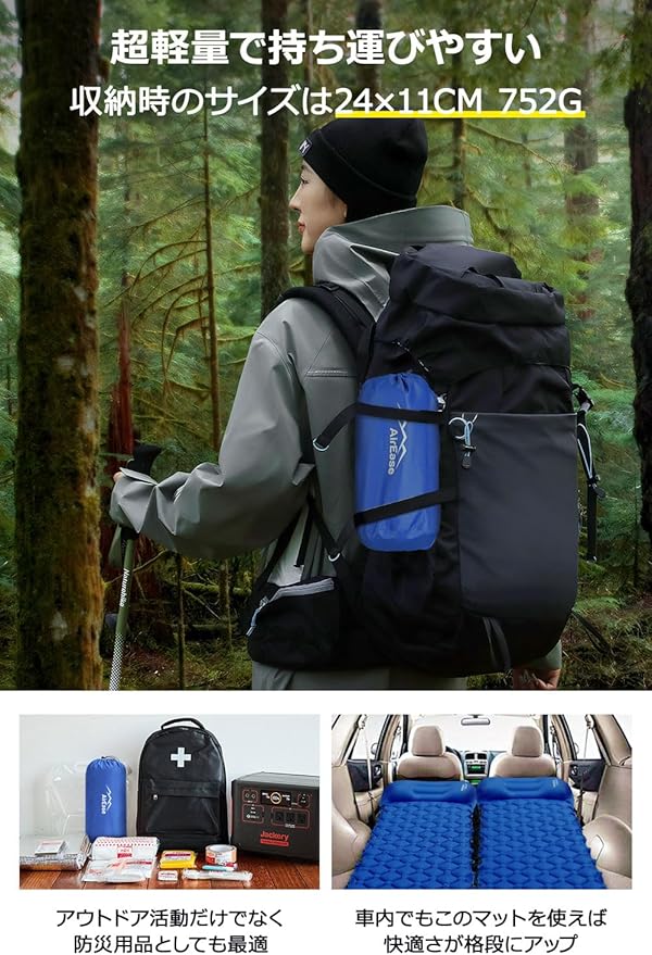 【携帯に便利・あらゆるシーンで大活躍】重さはわずか約752g、折り畳み後のサイズは24*11cmとコンパクト。バックパックにすっきり収まり、持ち運びも楽々です。キャンプ、登山、車中泊、災害時の備えとしても最適で、どこへでも気軽に持って行けます。いつでもどこでも最高の睡眠環境を提供します。