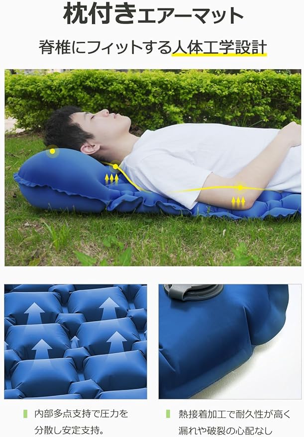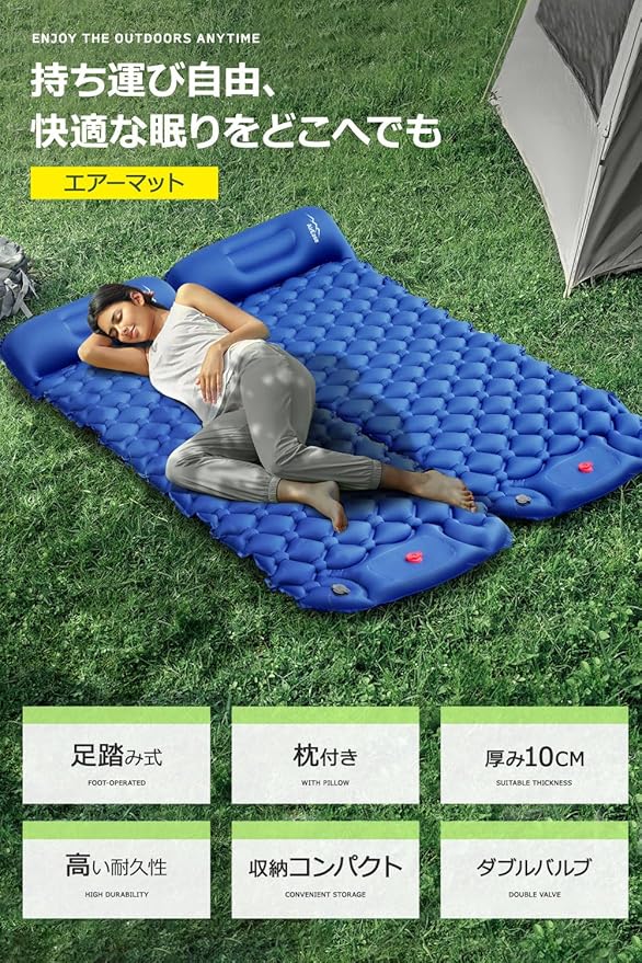 【極上の快適さ・枕付きエアーマット】サイズ195*70*10cmのキャンプ マットは、地面の凹凸や硬い岩から守ります。革新的な凹凸設計と枕付きで、背中と首の圧力を軽減し、仰向けでも横向けでも快適な睡眠を提供します。夜の自然の音を聞きながら、まるで自宅のベッドで眠っているかのような安らぎを体感できます。どんなに過酷なキャンプ地でも、このエアーマットがあれば一日の疲れをしっかり癒せます。