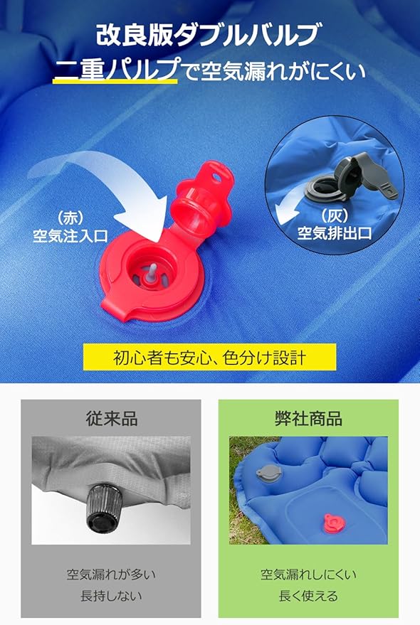 【初心者にも優しい・耐重設計】充気口と排気口は色で区別されており、赤は充気口、灰は排気口と一目でわかります。初心者でも簡単に使用可能です。熱接合技術によるエッジ加工で耐久性が向上しており、複数人が使用しても耐えられる設計です。最大耐荷重は200kgで、家族や友人と一緒に使っても安心してアウトドアを楽しめます。