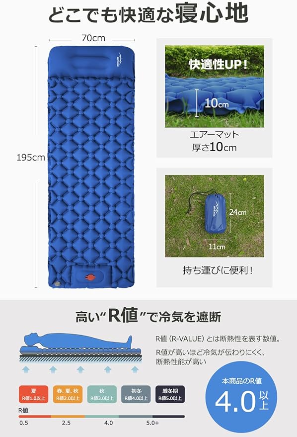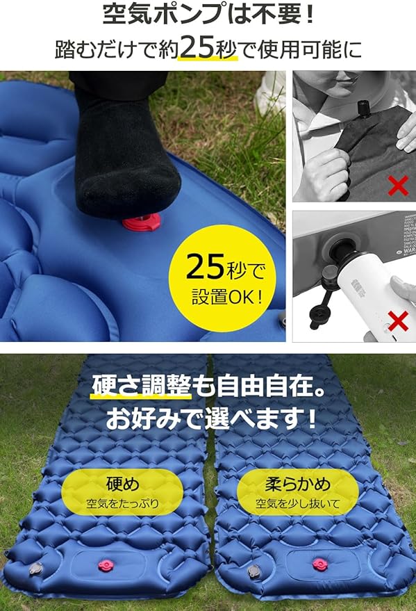 エアーマット キャンプ 足踏み式 【2025新開発&25秒膨らむ】 車中泊マット 枕が付き アウトドア 防災 寝袋 R値4.0 厚手 防水防潮 災害用 軽量 持ち運び便利 簡単収納 収納袋付き 日本語取扱説明書 | KAZESHOP
