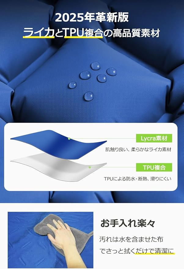 【耐久性&快適性を兼ね備えたデザイン】ナイロンよりも柔らかいライカ布地を使用し、TPUの防水防湿コーティングが施されています。これにより、耐摩耗性が高く、裂けにくくなっています。突然の雨でも安心、表面をサッと拭くだけで清潔を保てます。いつでもどこでも清潔で快適な睡眠を提供。キャンプや登山、車中泊や緊急時の避難所でも、このエアーマットがあれば安心です。