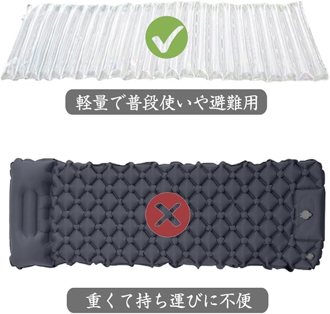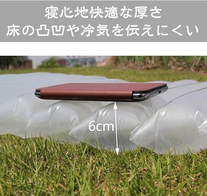 キャンプや車中泊、急な来客時まで幅広く使用。しっかり膨らせると約6㎝もの厚みになり、床面との熱を遮断し、硬くて冷たい床から寒さを和らげ、寝心地快適。