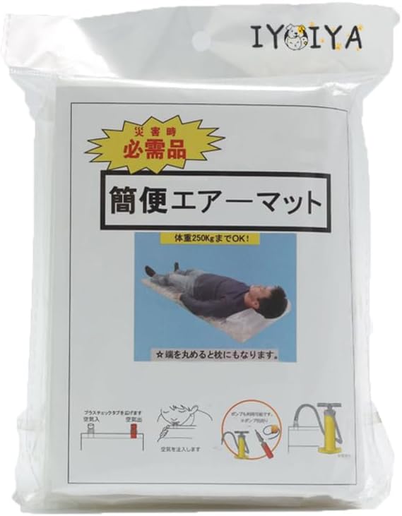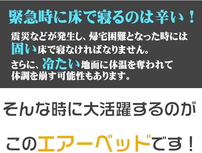 災害時に避難所等で使えるエアーマット。使用時は約長さ200 幅60cmで大柄な男性大人一人でも十分なシングルサイズ。250kgまで耐荷重。