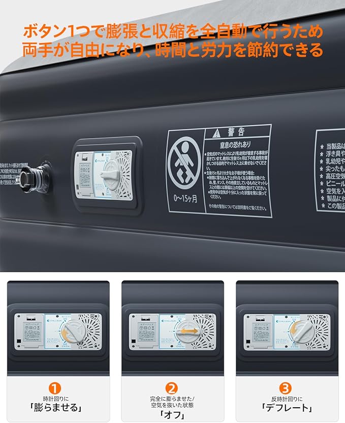 電動ポンプ内蔵で空気の出し入れ簡単◀ダイヤルスイッチタイプのAC100V電源使用の内蔵ポンプで、ダイヤルを回すだけで空気の注入も排出もできますので、初心者でも簡単に使用できます。体調や気分に合わせて、お好みの硬さに自由に調整ができます。※電動ポンプはAC100Vを使用するため、屋外使用時は発電機・ポータブル電源が必要になります