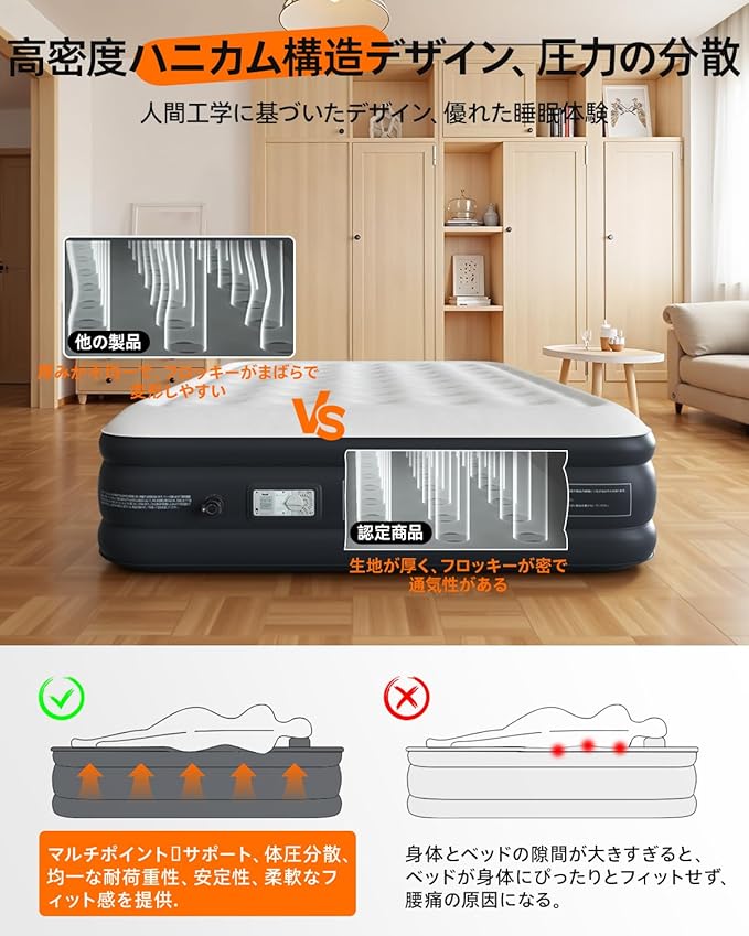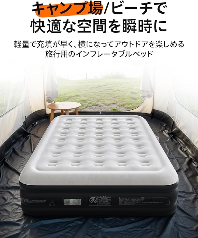 優れた耐久性・安定性◀エアベッド内部に高強度の繊維を使用し、軽量化を実現しました。側面と底面は耐候性・耐水性に優れたPVCを使用します。また、より多くの睡眠スペースを確保するため、特別に設計されたフチのデザインで、寝返りをしても安心です。エアーベッドの底部にも滑り止め設計が施され、安定感は抜群です