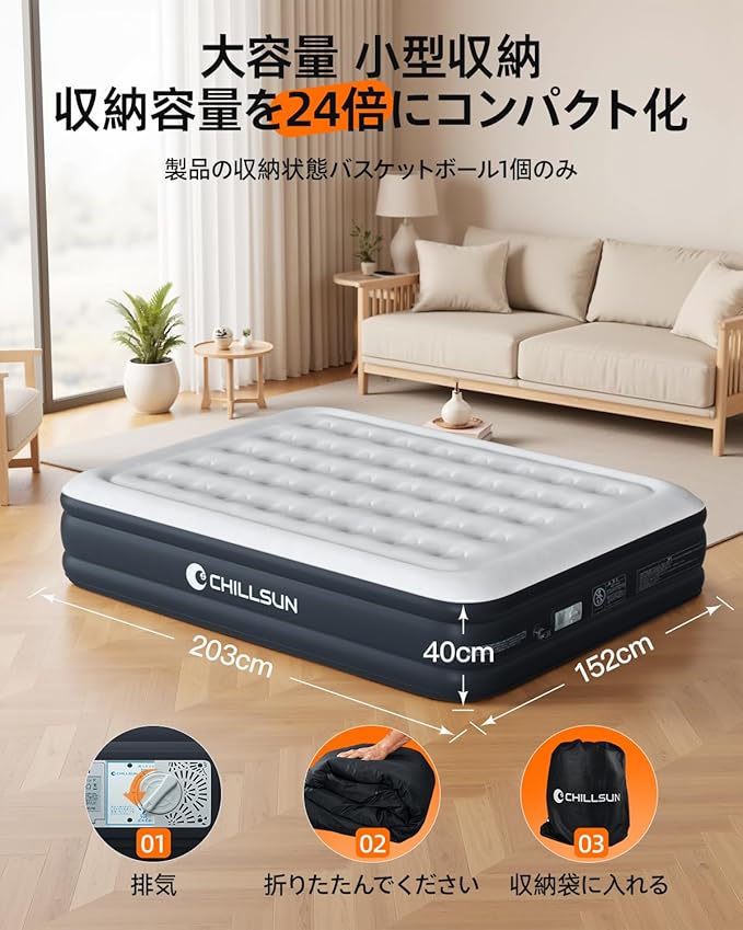 CHILLSUNエアーベッド ダブルサイズ 空気ベッド 電動ポンプ内蔵 フロック表面加工 長さ203 幅152 厚さ40cm 耐荷重400kg 耐久 極厚 軽量 防水防潮 折り畳み 収納バッグ付き キャンプ、旅行、家庭、防災、来客用 | KAZESHOP