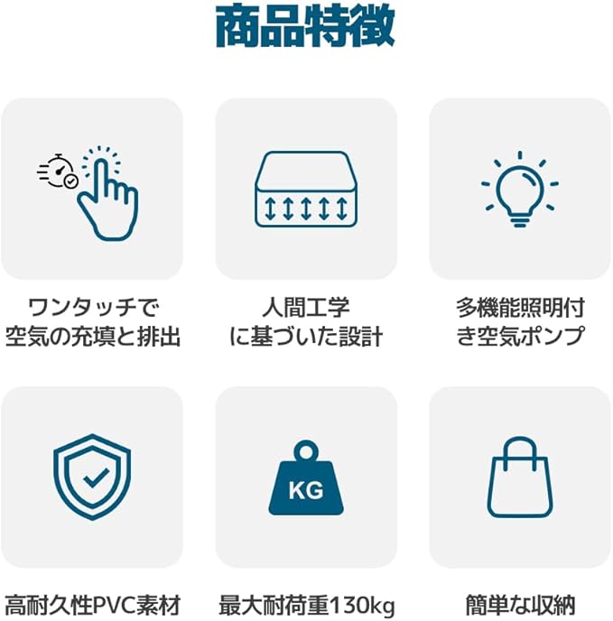 ☀簡単なメンテナンス:PVC素材は汚れに強く、お手入れが簡単。濡れた布で拭くだけで清潔に保つことができます。 優れた耐荷重性能:最大230kgまでの重さに耐えることができ、しっかりとした構造が、安定した快適な睡眠環境を提供します。