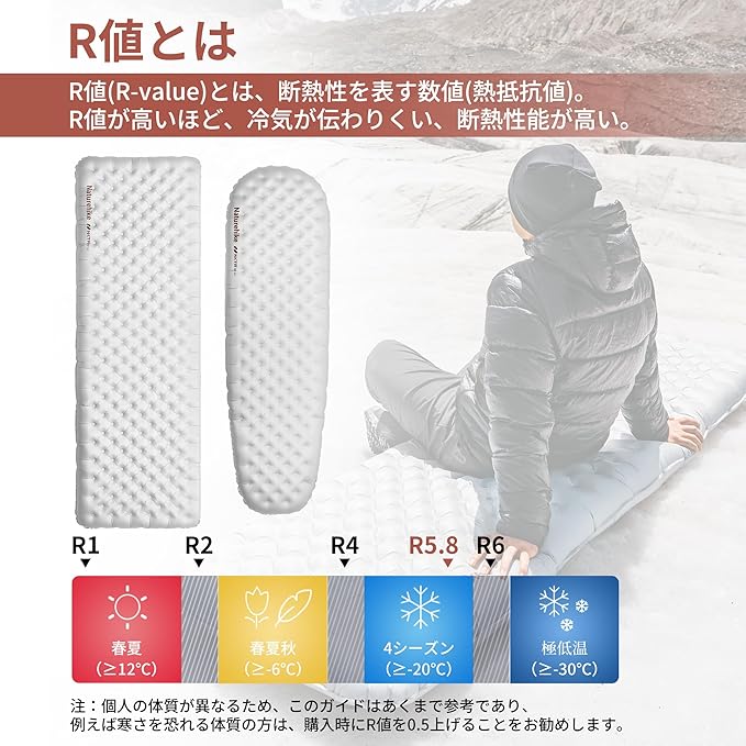【SGS認証取得済み高R値】R值(R-value)とは、断熱性を表す数值(熱抵抗値)。 R値が高いほど、冷気が伝わりくい、断熱性能が高いです。Naturehike高R値マットは、SGS 認証を取得しており、R5.8 とR8.8 は四季や極寒環境≥-20℃にも適しています。(※寒がりな人は、通常の適用温度より0.5R高いR値のマットを購入することをお勧めします)